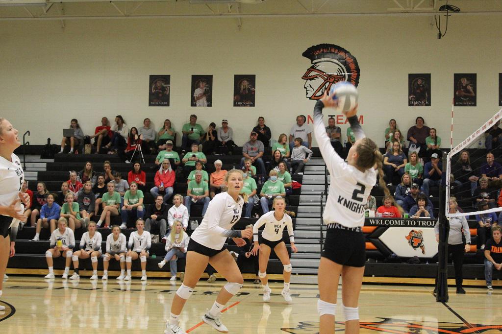 The Knights volleyball team consisted of three seniors this year; Kaitlyn Hansen, Halle Foslien, and Elizabeth Rustan. Senior managers were Halle Grosz and Lucy Bertrand-Schwindt. The rest of the team consisted of one junior; Lexi Hunter and sophomores; Whitney and Madelyn Westrom, and Alaina Sykora. Ninth graders Mya Fosien, Macy Grosz, Sophie Sanstead, and Addison Staples, along with eighth grader Izzy Puchalski made up this very young team.