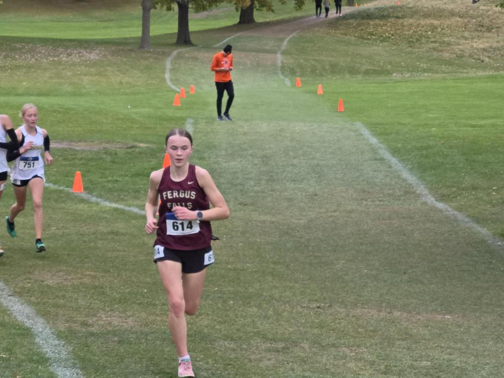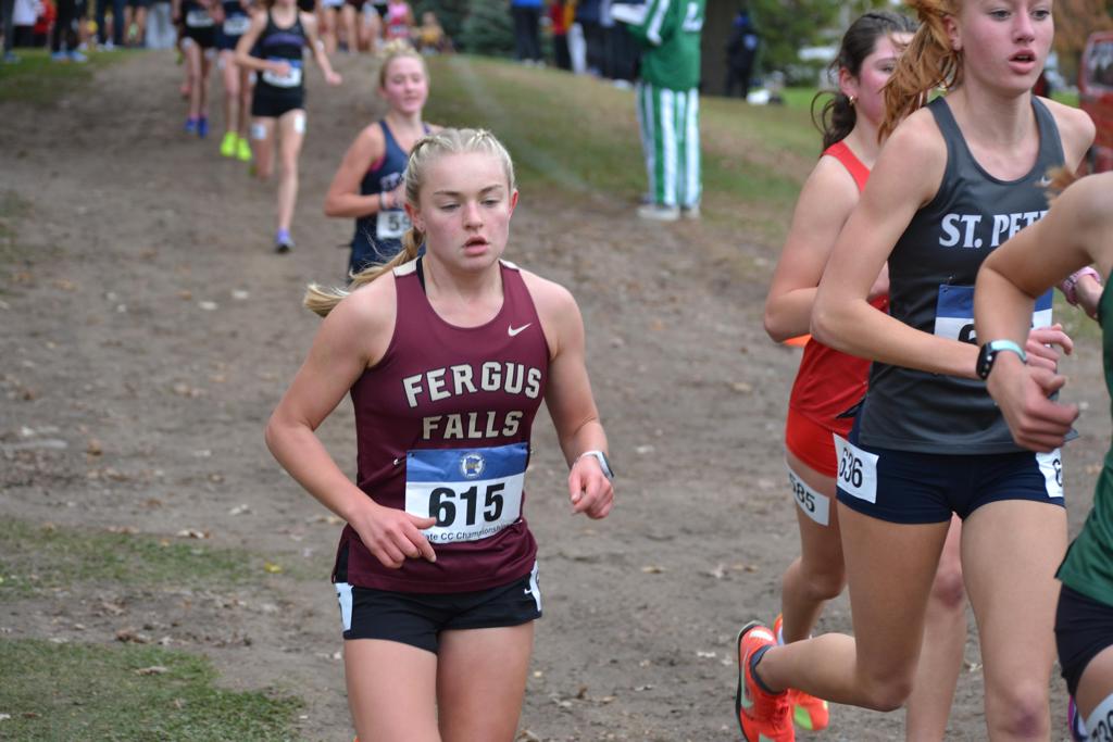 Cassie Wellman took home a medal Saturday with her 6th place finish (18:41.8) at the Class AA State Girls Cross Country Meet. “She ran an outstanding time, mixing it up with the lead pack throughout the race,” noted Fergus Falls Head Coach Niki Welde. “She also made the All-State Cross Country Team.”