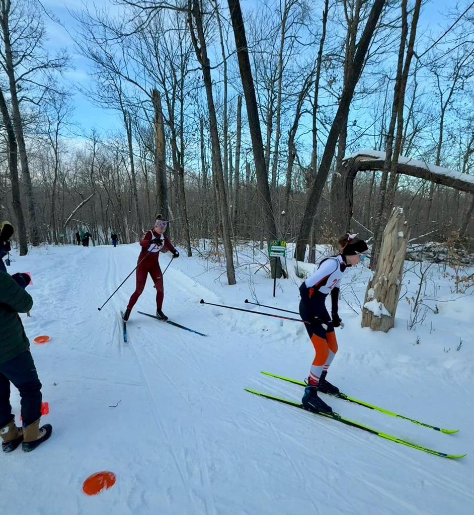 Most readers have become quite familiar with this year’s girls team. Senior Estee VerSteeg, juniors Ali Bredenberg, Cassie Wellman, and Violet McConn, and sophomore Lydia Uggerud made up our pursuit team. Havilah McConn and Evie VerSteeg were our relay team. Our alternates were sophomore Olivia Budke and freshman Lillya Ronnevik. After the morning skate race, Estee was in third, Ali in 4th, and Cassie in 7th, putting our girls in the lead to start the day, just ahead of the ever fierce Alexandria and Brainerd. Havi and Evie skied a very conservative but calculated relay prelim, finishing in the sixth position to claim the last spot for the afternoon finals. In the end, the relay girls turned all their conserved energy into a third place finish, beating out Alexandria and Brainerd and adding distance to our team score. Our pursuit girls hung tight in the afternoon classic ski race where Estee finished in third place on her combined score, Ali held on to 4th, and Cassie moved up a position to take away one more spot from Alexandria and finished in 6th. Lydia and Violet did not score for our team, but both had strong finishes that added to the overall Otter team effort.